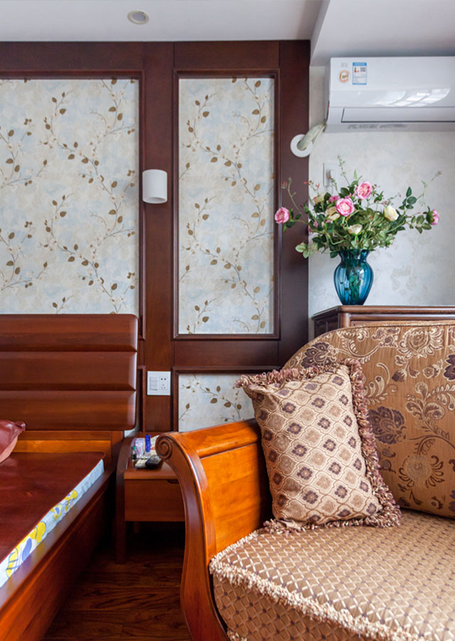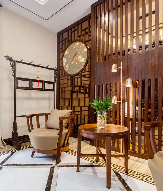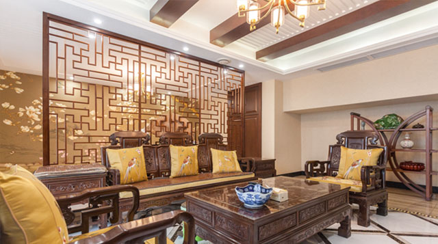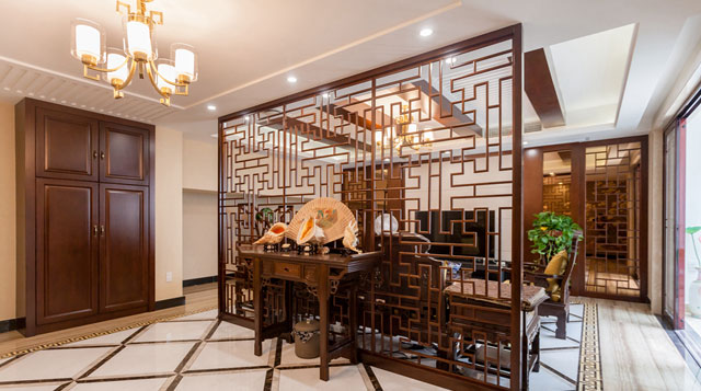 中式屏風(fēng)做成的護(hù)墻與中式刺繡搭配